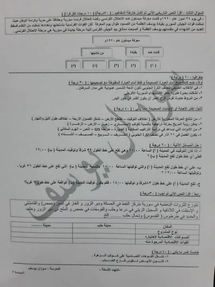 الامتحان النصفي الموحد في الدراسات الاجتماعية للصف التاسع الفصل الاول 2019 2020