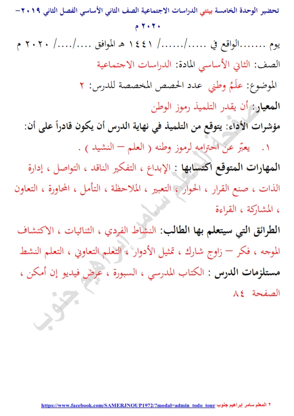 تحضير الوحدة السادسة وطني في الدراسات الاجتماعية للصف الثاني الفصل الثاني 2019 2020